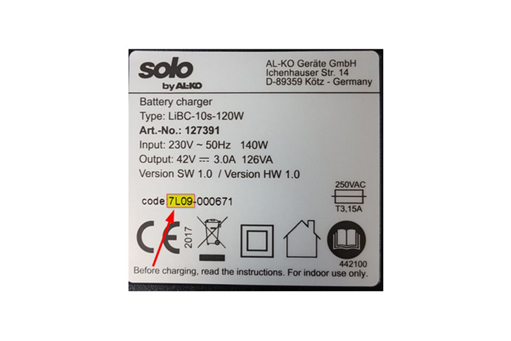 AL-KO bitten alle Kunden, die entsprechenden Ladegeräte (siehe Foto) unmittelbar vom Stromnetz zu trennen und nicht weiter zu verwenden. Das Unternehmen hat für betroffene Kunden zwei Servicelinien aufgebaut: Betroffen sind ausschließlich Ladegeräte mit der Artikelnummer 127391 und der Code- Nummer, die mit „7L09“ beginnt.