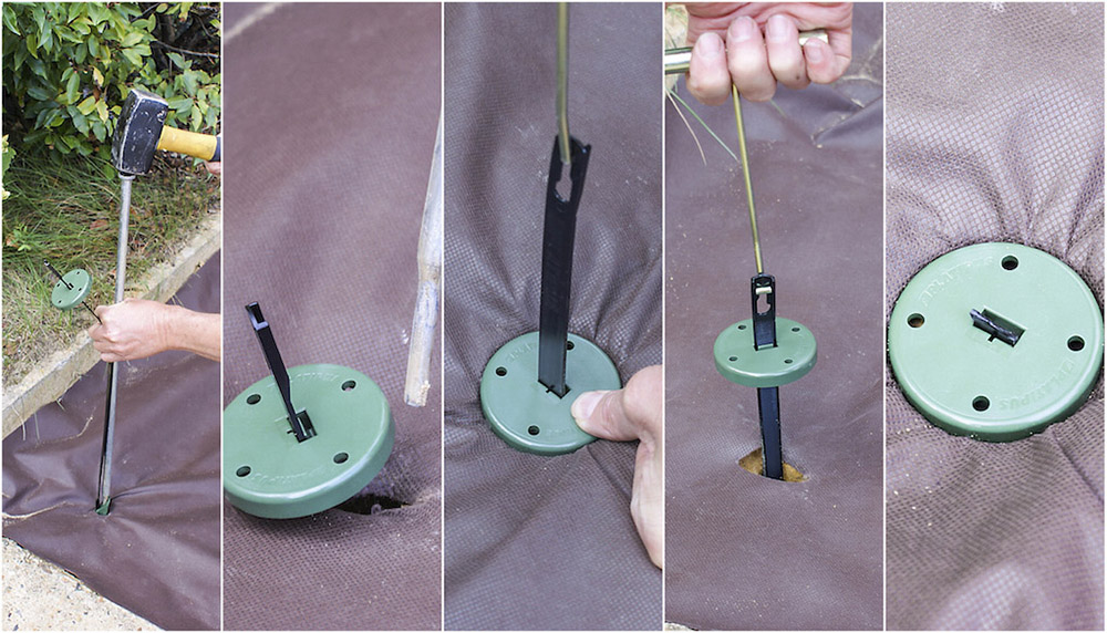 Die Montage ist denkbar einfach. Der gerippte Haltestreifen wird in den Erdanker eingeclipst und anschließend durch einen Schlitz in die Platte gefädelt. Das dabei entstehende Geräusch hat Platipus bei der Namensgebung inspiriert. Nach dem Einschlagen des Ankers durch das Abdeckmaterial und das Verriegeln drückt die Bodenplatte die Bahn fest an den Boden. Die feinen Rippen des Haltestreifens rasten ein und arretieren die Bodenplatte sicher. Der überstehende Haltestreifen wird mit einer Zange knapp über der Platte abgeknipst.