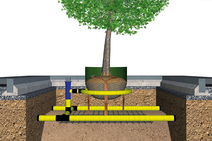 „Bei Neupflanzungen im Straßenbegleitgrün ist der Gießrand heute Standard“, sagt Carstens. Der große Vorteil: „In der Anwachsphase stellt man sicher, dass der Baum ausreichend Wasser erhält, denn das Füllvolumen wird entsprechend vordefiniert.“ Geliefert wird der Gießrand auf der Rolle – für passgenaues Zuschneiden vor Ort. Etwas mehr Vorbereitung ergibt sich bei Baumpflanzungen an Verkehrswegen und öffentlichen Plätzen. Diese werden üblicherweise als Baumscheiben ausgeführt: Meist ist dies zu wenig Erdoberfläche, um genug Wasser an die Wurzeln zu leiten. Schon bei der Planung wird daher das Gefa Luwa System integriert. Gemeinsam mit führenden Baumexperten entwickelt, steht Luwa für Belüftung und Bewässerung in einem.