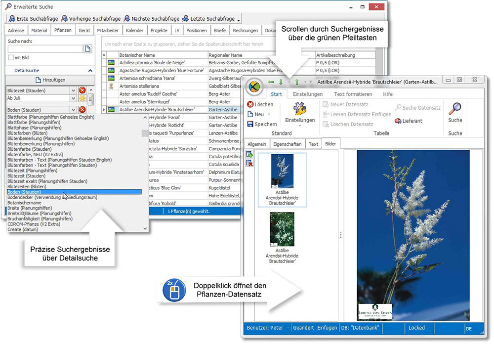 Über Pfeiltasten im Fensterrahmen navigiert man hierbei durch die Suchergebnisse. Alle Pflanzendaten und Bilder stehen anschliessend – z. B. für die Angebotserstellung – per Drag & Drop zur Verfügung.