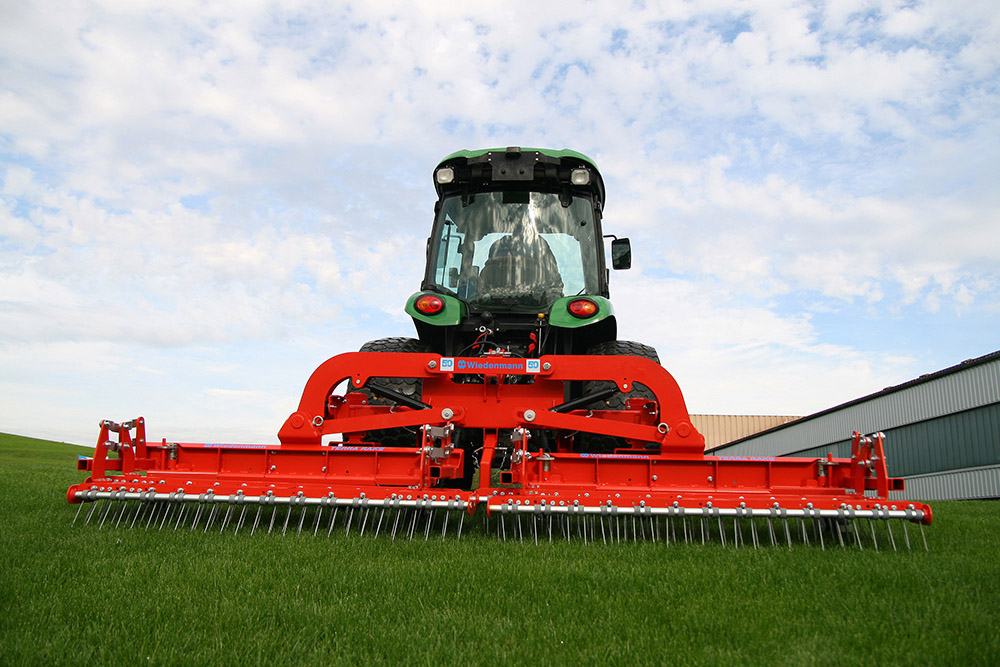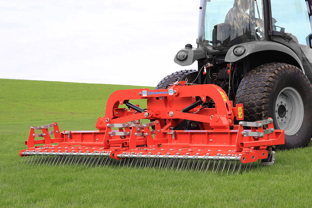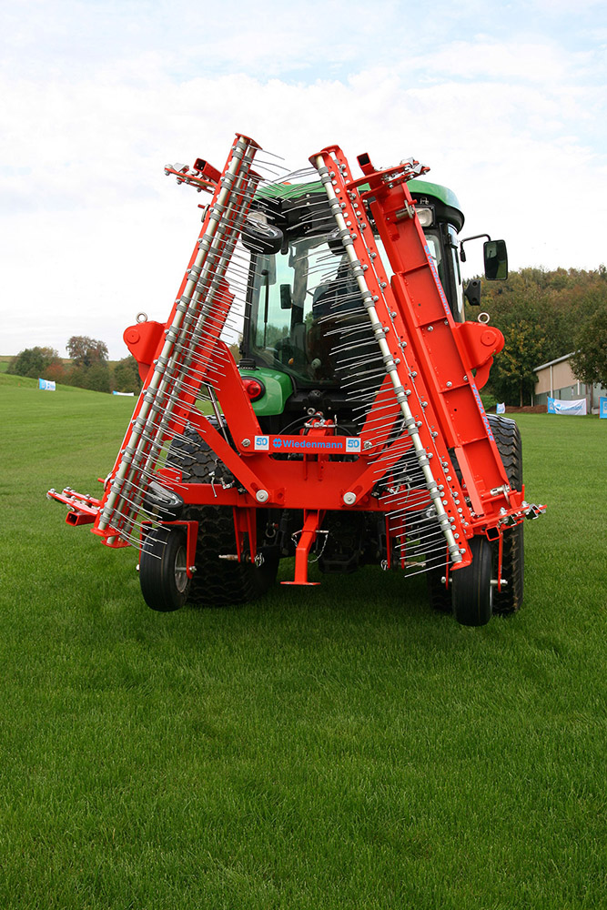 Vorgesehen ist die Terra Rake zum Einsatz am Heck-Dreipunkt von Kompakttraktoren. Die hohe Fahrgeschwindigkeit von 10 bis 15 km/h versetzt die mehrreihig im Parallelogramm angeordneten Vertikutierzinken derart in Schwingung, dass sie den Filz kraftvoll aus der Grasnarbe ziehen: Ein sauberes Arbeitsergebnis ist die Folge. Dabei soll ein Strichabstand von 16 mm zwischen den Zinken Verstopfungen effektiv vermindern. Den herausgearbeiteten Filz legt die Maschine oberflächig ab. Die beiden Vertikutierausleger der neuen Modelle fahren hydraulisch in die Transport- oder Arbeitsstellung, was die Handhabung erleichtert. In der Transportstellung zeigen die Zinken übrigens nach innen, was die Verletzungsgefahr stark verringert. Nach wie vor erhältlich sind die beiden einteiligen Modelle mit 210 und 160 cm Arbeitsbreite.Das kleinere Modell hat Wiedenmann überarbeitet: 10 cm Arbeitsbreite sind hinzugekommen. Optional ist ein Entlastungskit an den Terra Rakes montierbar, um besonders empfindlichen Rasen maximal zu schonen. Damit lässt sich dann auch Kunstrasen bearbeiten – zum Lockern von Sand, Gummigranulat und anderem Füllmaterial.