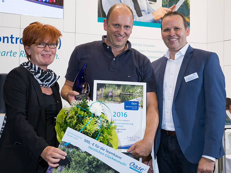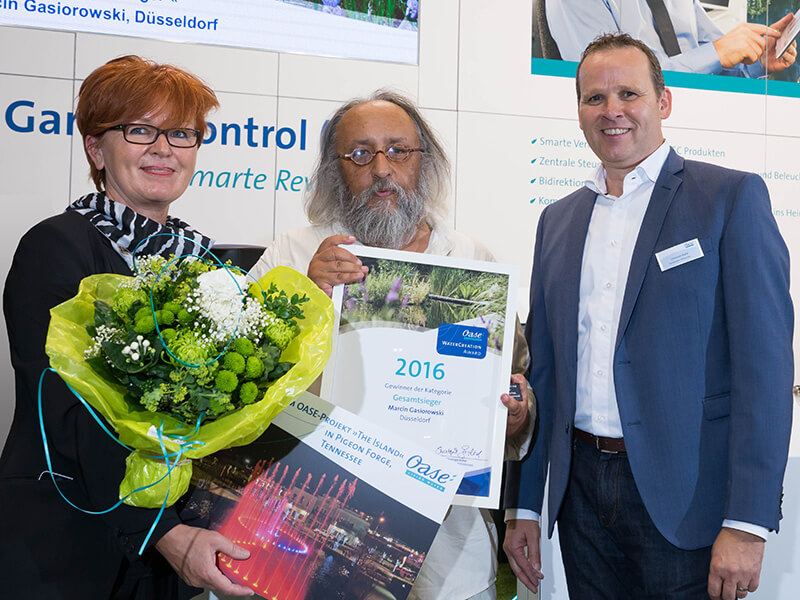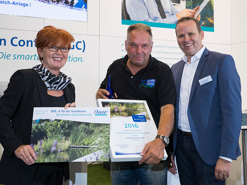 Im Rahmen der Messe GaLaBau in Nürnberg hat OASE zum vierten Mal in Folge den begehrten WaterCreation Award verliehen. Aus 39 eingereichten spannenden Projekten aus Deutschland und Österreich vergab die Jury Preise in den Kategorien „Naturnahe Anlage“, „Schwimmteich-Anlage / Naturpool“, „Architektonische Anlage“ und „Wasserinszenierung“. Aus allen Gewinnern wurde ein Gesamtsieger ermittelt – in diesem Jahr Marcin Gasiorowski aus Düsseldorf, der die Jury mit einer raffiniert gestalteten, naturnahen Anlage überzeugte und damit eine Reise zur OASE Multimedia-Showanlage Pigeon Forge in Tennessee, USA, gewann. Der Publikumspreis der im Vorfeld per Online-Voting ermittelt wurde, ging in diesem Jahr an die Firma Teichhilfe aus Drensteinfurt.
