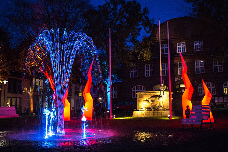 Moderne Beleuchtungstechnik – gepaart mit einem abwechslungsreichen Wasserspiel – bringen diesem schönen Springbrunnen den Gesamtsieg in der Kategorie Wasserinszenierung.