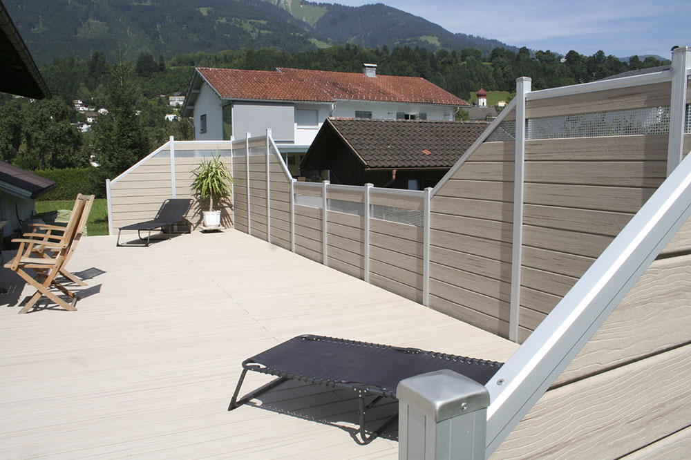 Profile aus eloxiertem Aluminium machen den Zaun nicht nur äußerst stilvoll, sondern auch extrem pflegeleicht. Die Sichtschutzelemente können einbetoniert oder aber auf bestehenden Betonflächen aufgedübelt werden.