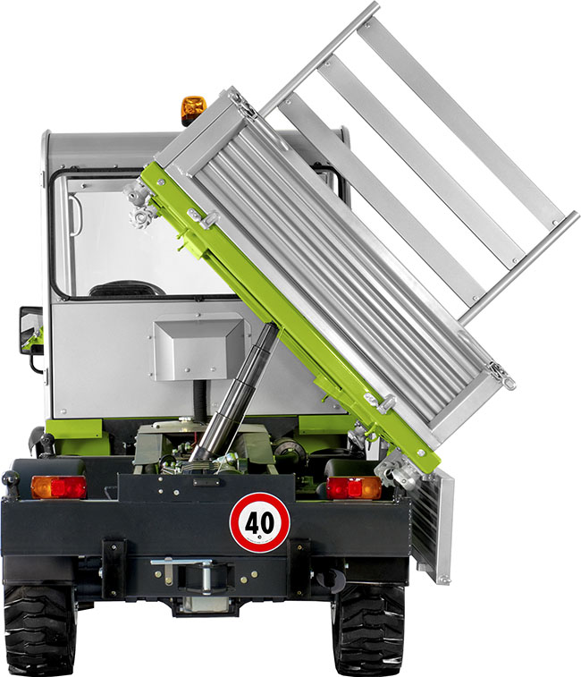 Die geräumige, robuste, hydraulisch dreiseitig klappbare Ladepritsche lässt sich durch eine elektrohydraulische Steuerung bequem vom Sitz aus anheben. Die Scharniere der Ladepritsche sind ge-räuscharm und gewährleisten eine perfekte Verriegelung. Ein Sensor signalisiert, dass die Ladepritsche vollständig umgeklappt ist.