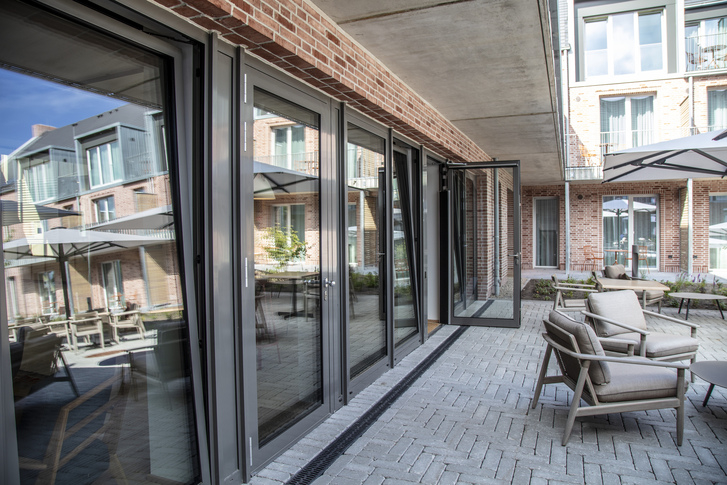 Für die Entwässerung der Terrassen und Eingangsbereiche fiel die Wahl auf das Rinnensystem ACO DRAIN® Multiline NX aus dem innovativen Werkstoff NEXITE®. Dieser Hochleistungsbeton ist zu 100 % recycelbar, extrem belastbar und dennoch leicht zu handhaben. „Die Optik passt perfekt zur Pflasterung, aber vor allem die nachhaltigen Gründe haben überzeugt“, berichtet Marks. Dank der integrierten Seal-in-Technologie sind die Rinnenstränge bereits während der Verlegung dauerhaft dicht – ohne zusätzliche Abdichtung. Das spart Zeit und Aufwand. Auch die Verarbeitung ist unkompliziert: „Mein Kollege war begeistert vom Plug-and-play-Prinzip“, so Marks.