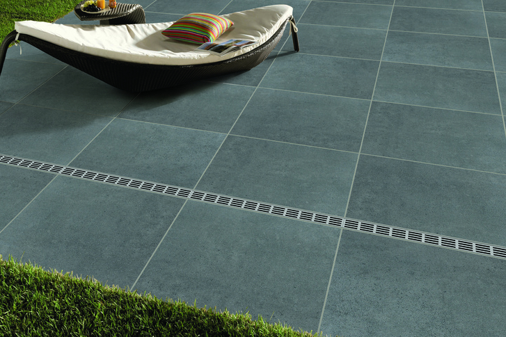 Ob Fliesen-, Natur- und Betonstein oder Feinsteinzeug-Oberflächen – mit nur sechs Zentimetern Breite fügt sich die begehbare Entwässerungsrinne dezent und unauffällig in die Fläche rund ums Haus ein. Weitere optische Akzente auf der Terrassenfläche lassen sich durch die Slimline-Designroste aus schwarz oder silber eloxiertem Aluminium, Cortenstahl oder Edelstahl setzen.