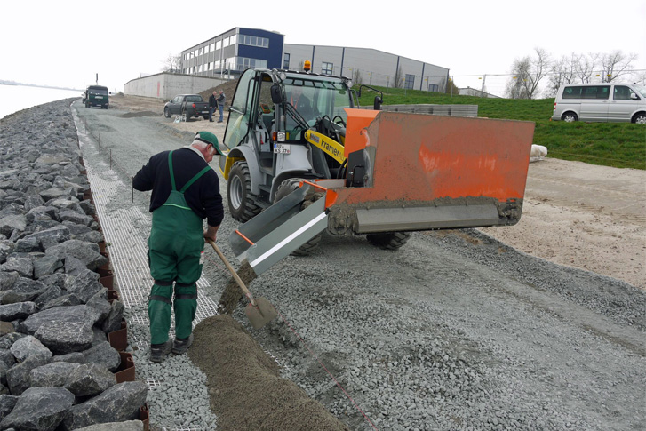 Mit der Materialverteilschaufel „Finliner“ stellt Optimas nach Herstellerangaben eine weltweite Innovation vor. Finliner ist ein Anbaugerät für Radlader. Es dient dazu, Beton, Sand, Split, Schotter oder anderes Material gleichmäßig und präzise dosiert an den vorgesehenen Stellen einzubringen.