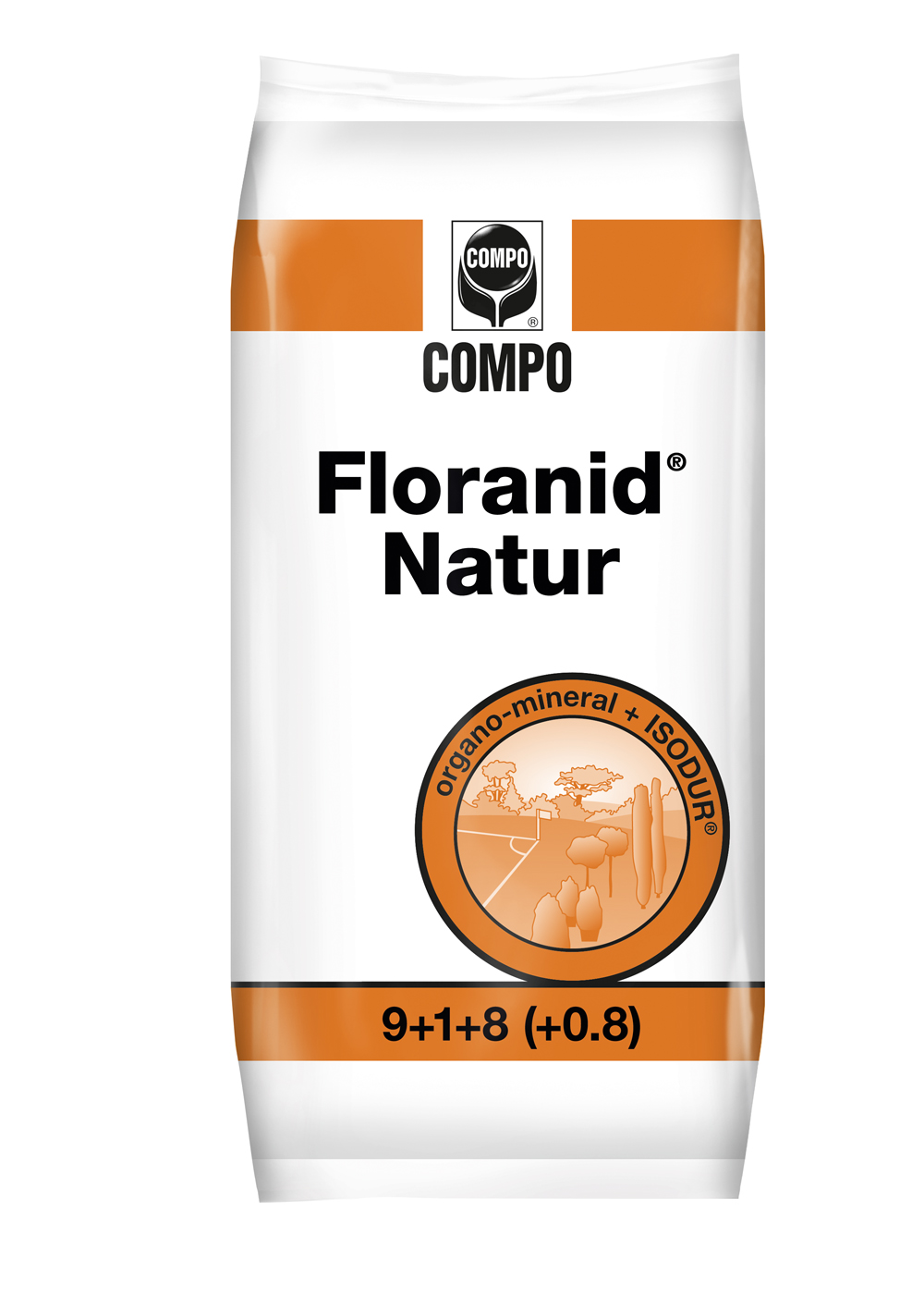 Mit Floranid® Natur stellt COMPO EXPERT dem Garten- und Landschaftsbau sowie dem Öffentlichen Grün einen neuen granulierten organisch-mineralischen Langzeitdünger für Rasen, Sträucher und Blumenbeete zur Verfügung. Floranid® Natur bietet durch ISODUR®-Langzeitstickstoff und einen hohen Anteil organischer Substanz eine doppelte Wirkung: Einerseits wird die langfristige Versorgung der Pflanzen mit Nährstoffen gesichert, andererseits werden durch die Bereitstellung von stabilen Humusbestandteilen die Bodenfruchtbarkeit verbessert und das Bodenleben gefördert.