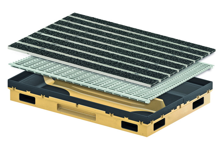 Die korrosionsfreie Zarge und die rutschsicheren Einleger – wahlweise aus Rips, Gummi oder Outdoor-Material – bieten sicheren Halt und sind rollstuhlbefahrbar. Der V-Rost aus verzinktem Stahl erreicht die Rutschhemmungsklasse R12. Für stark frequentierte Bereiche steht ein befahrbarer Rost der Klasse B 125 zur Verfügung.