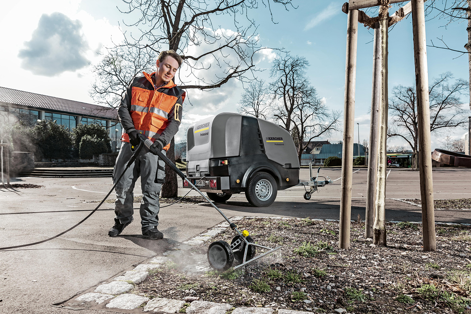Zur Anwendung kommt der Geräteträger bei Bauhöfen und Dienstleistern in Städten und Gemeinden und in der Industrie. Gerade im Sommer wächst und sprießt Unkraut in allen Ritzen, Fugen und Ecken. Das gilt es auf schonende Weise möglichst effizient und nachhaltig abzutöten. Mit dem neuen Zubehör „Weed Control“ für seine Heißwasser-Hochdruckreiniger stellt Kärcher dazu eine Lösung vor: die drucklose Ausbringung von heißem Wasser.