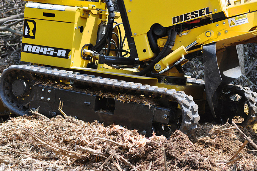 Da die Einsatzgebiete immer ausgefallener und extremer werden, bietet die Rayco RG 45 Kette nun ein beidseitig ausfahrbares Gummikettenfahrwerk. Die Spur der Stubbenfräse wird auf Knopfdruck von 89 cm auf hangtaugliche 127 cm erweitert. Fräsarbeiten parallel zum Hang oder in schlammigen Gebieten werden so zu attraktiven Aufträgen. Die Ölmenge für das Fahrwerk wird von zwei separaten Hydraulikpumpen erzeugt, so bleibt immer genug Kraft für härteste Bedingungen.