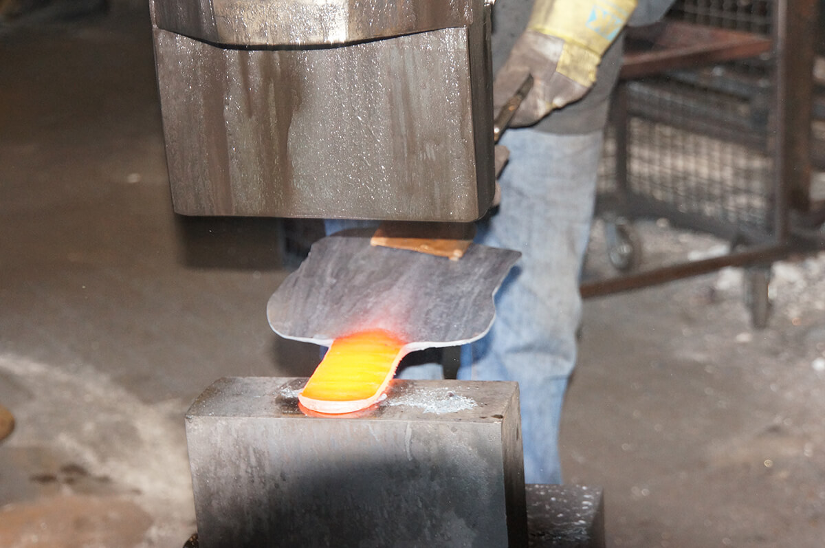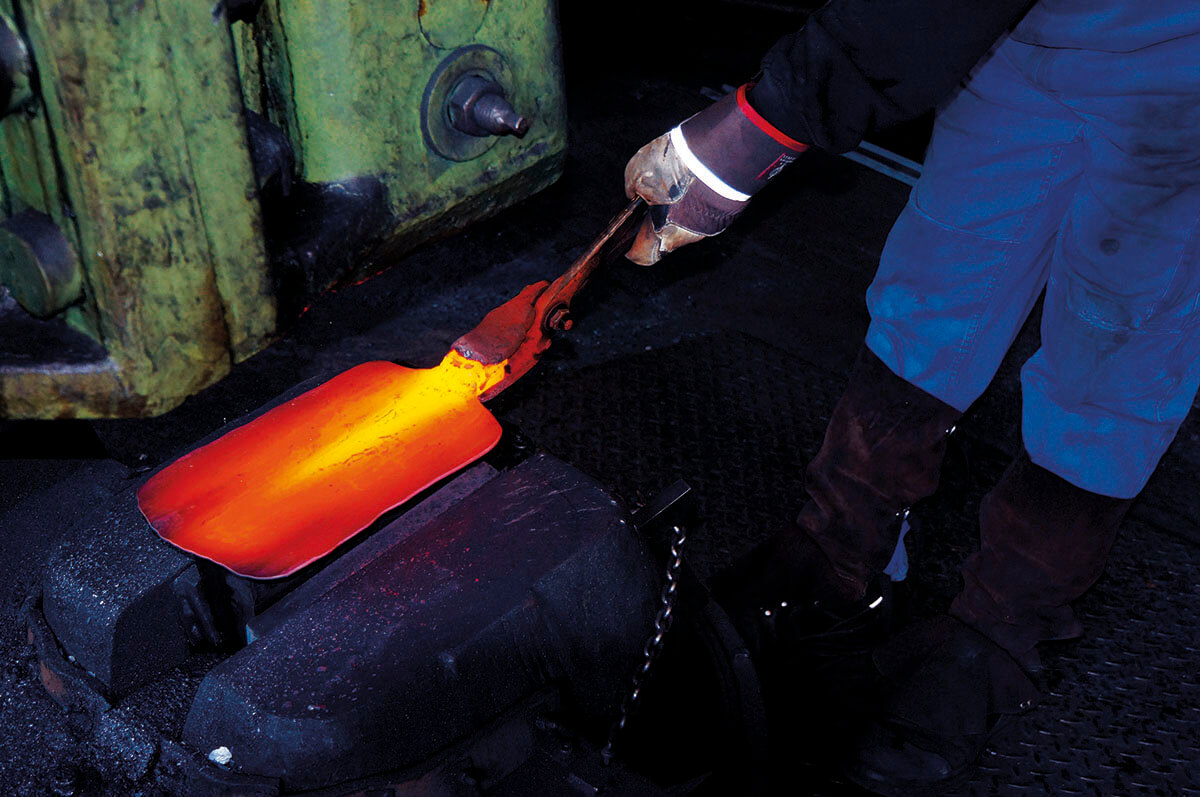 Schwere Hammerschläge erschüttern die Luft: Mit 98 Schlägen pro Minute donnert der 250 kg schwere luftbetriebene Schmiedehammer auf den glühenden Rohling. Über 150 Schläge treiben die Stahlmoleküle in eine extrem hohe Verdichtung und machen das Spatenblatt so bruchfest und elastisch, dass es fast als unverwüstlich gelten kann …