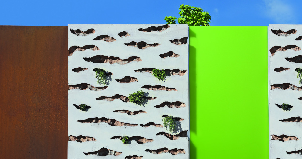 Die Acrylglas-Elemente sind in den Farben Flamingo-Pink, Tundra-Grün oder Atlantik- Blau verfügbar. Alternativ ergänzen Cortenstahl- Elemente in einem erdigen, ruhigen Braunton die kühl-grauen Betonelemente und präsentieren sich dem Betrachter mit einem attraktiven Kalt-Warm-Kontrast.
