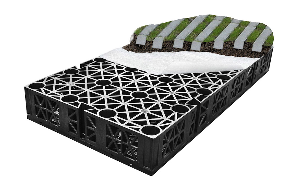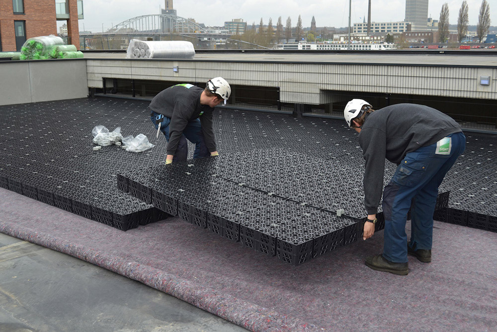 Basis für die Systemlösung ist die Wasserretentionsbox WRB 75 (für begrünte Aufbauten) bzw. WRB 85 (mit Lastverteilungsplatte für Verkehrsflächen). Die WRB aus druckstabilen und verrottungsbeständigen Kunststoff in der Bauhöhe von 75 Millimeter schafft in Verbindung mit einer Anstaudrossel ein mögliches Wasseranstauvolumen von bis zu 62 Liter/Quadratmeter. Über die Wasserretentionsbox wird das stabile Filtervlies Typ 300 (GRK 5) verlegt und darüber folgt entweder der Dachbegrünungsaufbau mit Extensiv-, Intensiv- oder Rasensubstrat oder der Verkehrsflächenaufbau mit 10-20 Zentimeter Tragschicht, 3-5 Zentimeter Bettungsschicht und Belag. Die WRB und das ganze System ist so konzipiert, dass das angestaute Überschusswasser aus dem darüber liegenden Schichten rausgehalten wird und bei unbegrünten Verkehrsaufbauten kein Kapillarwasser nach oben in die Tragschichten gelangt.