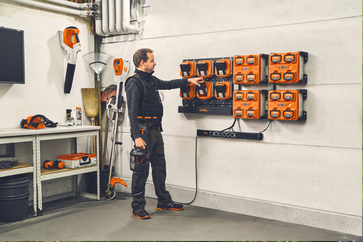 Diese Verlässlichkeit bietet die neue Akku-Ladesteuerungen CM 10 von STIHL. Die kostengünstige Plug & Play-Lösung wird über die Steckdose des normalen 220-V-Hausanschlusses betrieben – eine Elektro-Installation ist nicht erforderlich. Auch der mobile Einsatz auf einem Fahrzeug ist möglich. Die STIHL CM 10 verfügt über zwei farblich unterscheidbare Gruppen mit jeweils 5 Steckplätzen für den Anschluss von Akku-Lageräten. Dabei wird eine der beiden Gruppen bei der Verteilung des verfügbaren Stroms priorisiert, sodass ausgewählte Akkus bei Bedarf über die hier angeschlossenen Ladegeräte schnell geladen werden können. Während des Ladens über Nacht werden dann dank der intelligenten Steuerung beide Ports abwechselnd priorisiert und die jeweils angeschlossenen Ladegeräte mit Strom versorgt. Dieses intelligente Umschalten sorgt dafür, dass die Kapazität des Hausanschlusses optimal ausgenutzt wird, und ermöglicht eine Verdoppelung der Ladegerät-Steckplätze in einem Sicherungskreis, ohne dass die Sicherung „herausfliegt“. Die STIHL CM 10 ist mit den unterschiedlichen Ladegeräten von STIHL kompatibel, sodass beispielweise mit AL 301-4 Mehrfachladern bis zu 40 Akku-Packs aus dem STIHL AP-System über Nacht verlässlich geladen werden können. Dem sofortigen Start am nächsten Morgen steht so nichts im Wege.