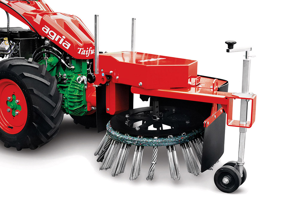 Zur optimalen Anpassung des Arbeitsgerätes an unterschiedlichste Gegebenheiten lassen sich sowohl der Bürstendruck als auch die Bürstenneigung stufenlos verstellen. Ein einstellbares Schutztuch verhindert effektiv das Herausschleudern von Steinen und Wildkraut. In Verbindung mit einem agria-Geräteträger lässt sich mühelos Wildkraut auf unterschiedlichen Pflasterflächen, in Fugen, an Kantsteinen sowie an Gebäudekanten entfernen.