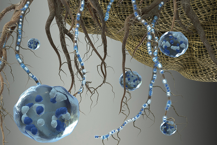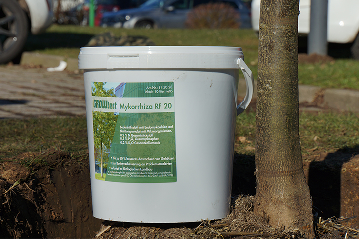 Weiter verbessern lässt es sich bekanntlich mit dem Einsatz von Mykorrhiza-Pilzen. GROWtect Mykorrhiza RF 20 geht mit ca. 80 % aller Pflanzen eine Symbiose ein. Man kann vereinfacht von einer Vervielfachung der Wurzeloberfläche reden. Die Pilze erschließen für den Baum Wasser und mineralische Nährstoffe und bekommen dafür Kohlenhydrate. Mykorrhizierte Pflanzen sind dauerhaft besser gegen Stressfaktoren gerüstet. Der Blähton als Trägersubstanz verbessert gleichzeitig die Bodenstruktur.
