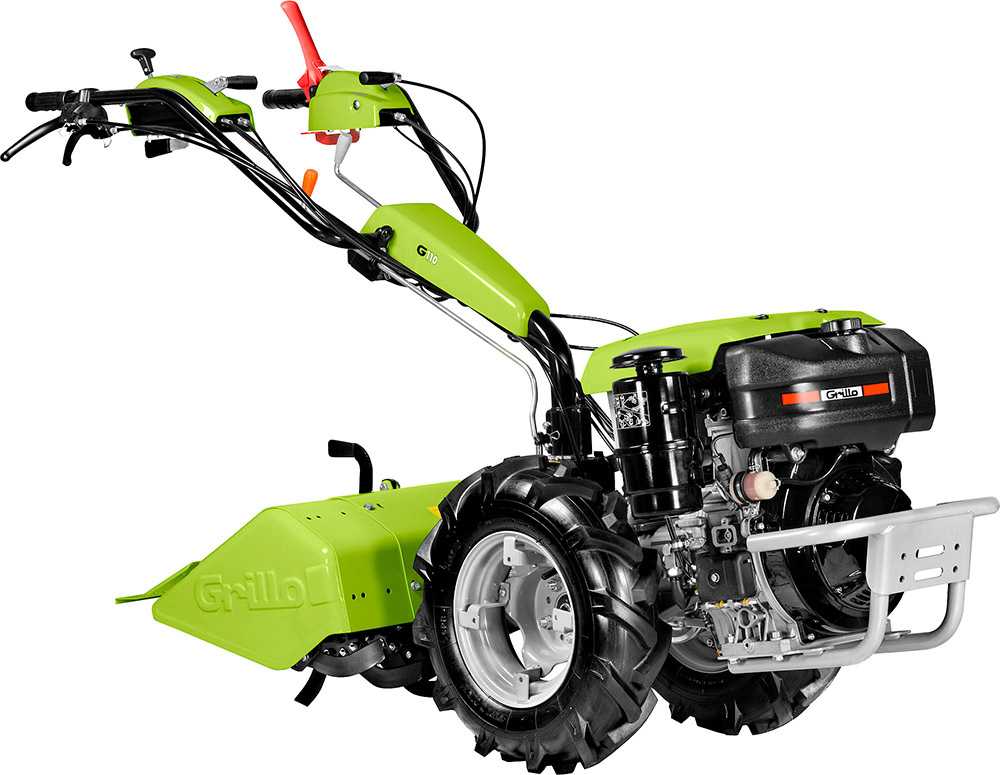 Die Modelle Grillo G 108 und der leistungsfähigere G 110 sind ideal für den Gartenbau, Obstplantagen, Obstgärten und Gemüsebeete. Der G 108 ist mit einem Honda GX 270 Benzin- oder mit einem 15 LD 350 Dieselmotor, der G 110 mit einem Honda GX 390 Benzin- oder mit einem 15 LD 440 Dieselmotor erhältlich. Alle Motoren sind durch eine robuste vordere Stoßstange geschützt. Die Benzinmotoren sind zudem mit einem abnehmbaren Gegengewicht ausgestattet. Die Modelle verfügen über ein 6-Gang-Schaltgetriebe mit 3 Vorwärts- und 3 Rückwärtsgängen und sind mit Zahnrädern im Ölbad und Differentialsperre ausgestattet.