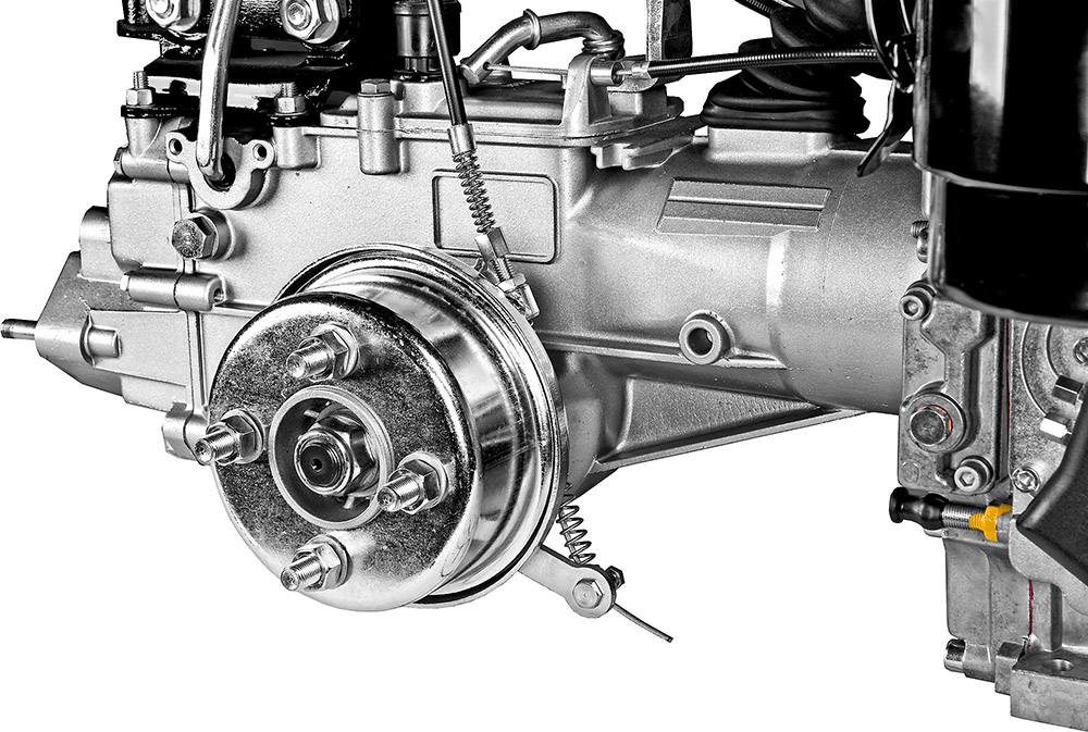 Die serienmäßige Aktivkupplung stoppt sofort die Maschine und das Zubehör, sobald der Nutzer den Lenkholm loslässt, der Motor läuft aber weiter. Die Bedienung der Vorwärtssteuerung und der Zapfwelle, an die das Zubehör angeschlossen werden kann, sind voneinander unabhängig.