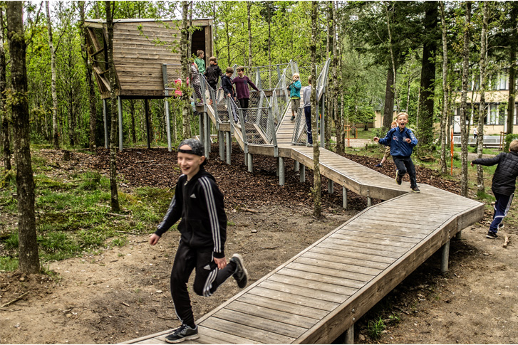 Die Skørping Schule (Rebild/Dänemark) hat einen interaktiven Spielplatz aus Kebony-Holz geschaffen. Das Projekt wurde von den Landschaftsarchitekten von VEGA Landskab ausgeführt und fügt sich perfekt in die natürliche Umgebung der Schule ein. Ein erhöhter Holzsteg, die so genannte „Waldschlaufe“, schlängelt sich durch den gesamten Spielplatz. Dieser besteht aus Kebony und führt vom Schulhof in den anliegenden Wald. Kebony wurde ausgewählt, da es extrem belastbar und widerstandsfähig ist. Außerdem ist es komplett ohne chemische Schadstoffe haltbar gemacht – das macht es zur ersten Wahl für einen Spielplatz mit direktem Kontakt der Kinder mit dem Holz. Anne Galmar, Landschaftsarchitektin und Partnerin bei VEGA Landskab, ist voll zufrieden mit ihrer Wahl: „Das Holz passt sehr gut in die Landschaft rum um die Schule, sowohl zur natürlichen Umgebung des Waldes, als auch zu den mehr städtischen Teilen mit dem Skate-Park. Wir haben Kebony bereits 2012 für einen anderen Spielplatz genutzt und wissen daher, wie schön sich auch die Farbe mit der Zeit entwickelt.“