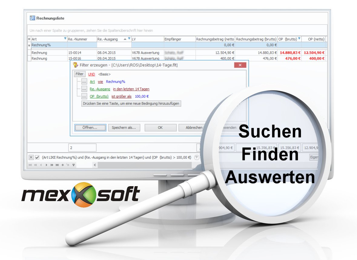 Ein typisches Beispiel: Welche Rechnungen des letzten Quartals mit überschrittenem Zahlungsziel und Beträgen von über 500 Euro sind noch offen? Mit wenigen Klicks haben Sie das Ergebnis – sofort ausdruckbar oder bereit für den Export im Excel-Format. Nie war das Suchen und Finden einfacher.