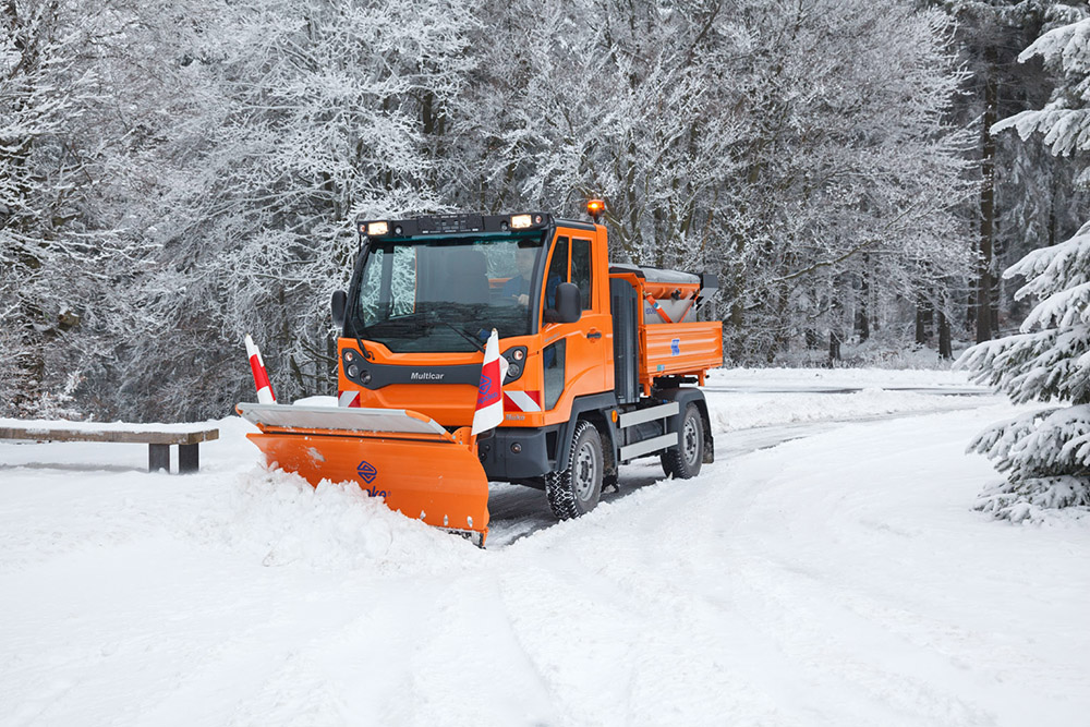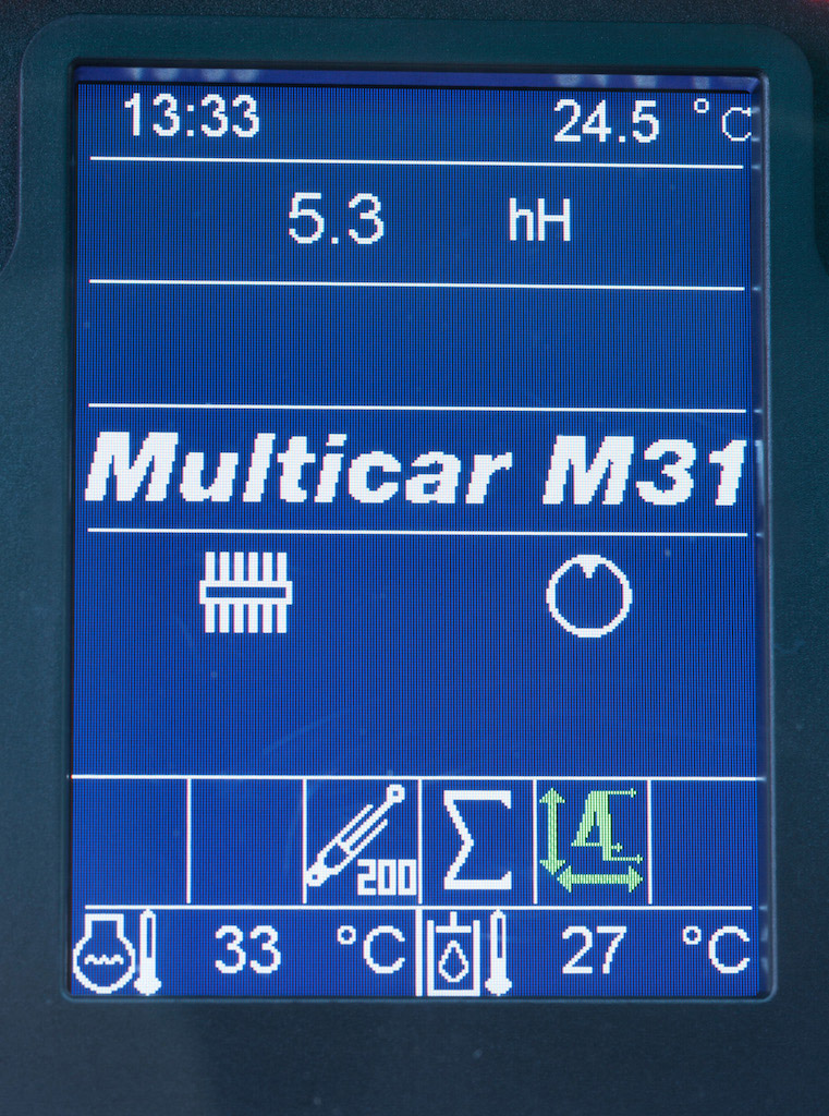 Für die Praxis hat dies einen ganz entscheidenden Vorteil, was sich an folgendem Beispiel eindrucksvoll zeigt: Wird ein großer Parkplatz von Schnee und Eis befreit, muss der Fahrer normalerweise mehrere hundert mal die Arbeitshydraulik umschalten, um den Schneepflug anzuheben und auch wieder abzusenken. Die Flächenräumfunktion denkt nun mit. Wenn in aller Frühe die Vorbereitungen für den Einsatz getroffen werden, wählt der Fahrer des Multicar M31 Euro VI über einen Dreh-Drück-Steller die Flächenräumfunktion vor. Das Multifunktionsdisplay zeigt dann die vorgewählte Funktion an. Ist er am Einsatzort angekommen, drückt er auf einen Knopf an seiner Armlehne und aktiviert das System. Mit automatisch abgesenktem Schneeflug in Arbeitshöhe fährt das Fahrzeug vorwärts. So wird die Fläche einwandfrei geräumt. Legt nun der Fahrer den Rückwärtsgang ein, hebt sich der Schneepflug automatisch und verharrt in der angehobenen Position. Sobald er wieder vorwärts fährt, senkt sich der Schneepflug auf Arbeitshöhe ab.
