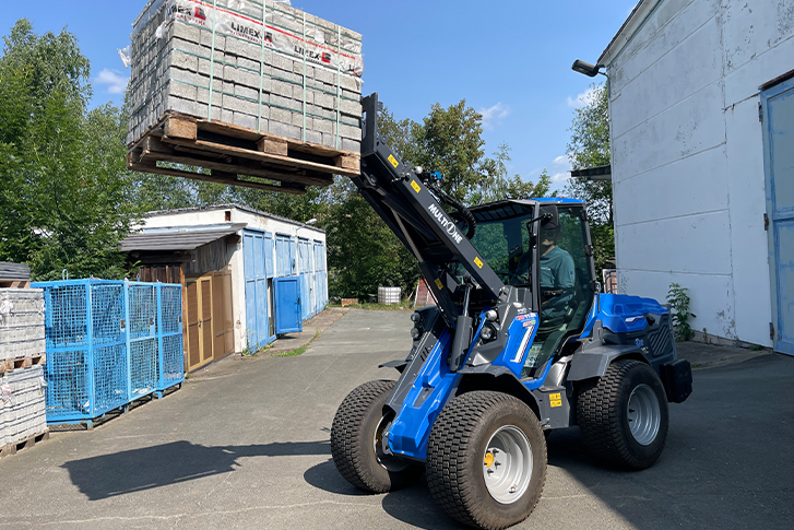 Quintessenz nach einem Jahr im Einsatz: „Wir haben die Entscheidung völlig richtig getroffen“, stellt Crasselt zufrieden fest. Besonders mit der gewählten Kommunalbereifung hat der Bad Schlemaer eine Punktlandung erzielt: „Wir hinterlassen keinerlei Abdrücke auf dem frisch verlegten Pflaster, nicht einmal auf feuchten Rasenflächen.“ Genutzt wird der 11.6 auf Baustellen zum Transport von Pflastersteinen, Steinen oder Findlingen, Schüttgütern sowie diversem Material, außerdem auf dem firmeneigenen Lagerplatz zum Be- und Entladen. Hierfür verwendet der Mittvierziger aus dem „Riesenangebot an Anbaugeräten“ eine Schaufel sowie eine Palettengabel am Lader. „Interessant wäre für mich auf Sicht auch eine Grabenfräse“, blickt der Firmen-Chef in die Zukunft. Und auch diesen Kauf wird der bodenständige Erzgebirgler sicherlich per Handschlag besiegeln.