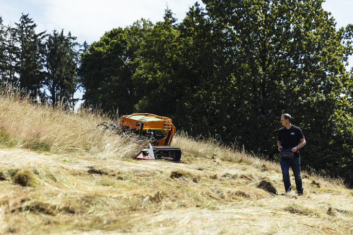 Die robuste Stahlrohrrahmenkonstruktion des Mähwerks ist pulverbeschichtet und feuerverzinkt und somit bestens gegen Korrosion und Verschleiß gewappnet. Ein speziell entwickelter Anbaurahmen mit integrierter Pendelaufhängung sorgt auch in großen Steillagen für eine optimale Bodenanpassung. Durch das höhenverstellbare Kopplungssystem lässt sich das Mähwerk exakt auf die jeweilige Funkraupe abstimmen. Der geringe Kraftbedarf und der minimale Bodendruck ermöglichen zudem ein äußerst bodenschonendes Arbeiten – ideal für sensible oder schwer zugängliche Flächen wie wasserführende Gräben.