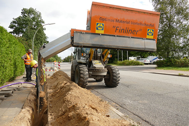 In Neumünster verlegt die EBS GmbH etwa 40 Kilometer Glasfaserkabel für schnelles Internet. Mit im Einsatz ist der Optimas „Finliner“, ein Anbaugerät. Der „Finliner“ ist eine Material-Verteil-Schaufel. Sie wird hydraulisch betrieben und an einen Radlader angebaut. Das geht per Schnellwechlser sehr flott. Ist der „Finliner“ montiert, kann er um 90° nach vorn geschwenkt werden. Dann nimmt man zum Beispiel Verfüllsand auf. Bis zu 1 m³ fasst das Gerät. Nun wird zu dem zu verfüllenden Graben gefahren. Parallel zu ihm fährt der Radlader und der Sand wird per Förderband kontinuierlich exakt dosiert und flächengenau verteilt.