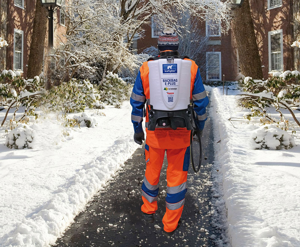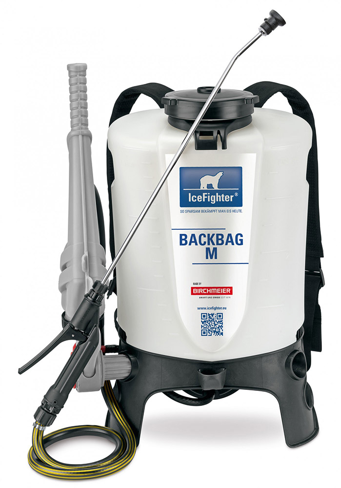 Birchmeier hat exklusiv für Eco Technologies den tragbaren Solesprüher IceFighter® BackBag entwickelt. Damit kann Eis und Schnee auch auf Gehsteigen, Treppen und anderen schwer zugänglichen Flächen mühelos entfernt werden.