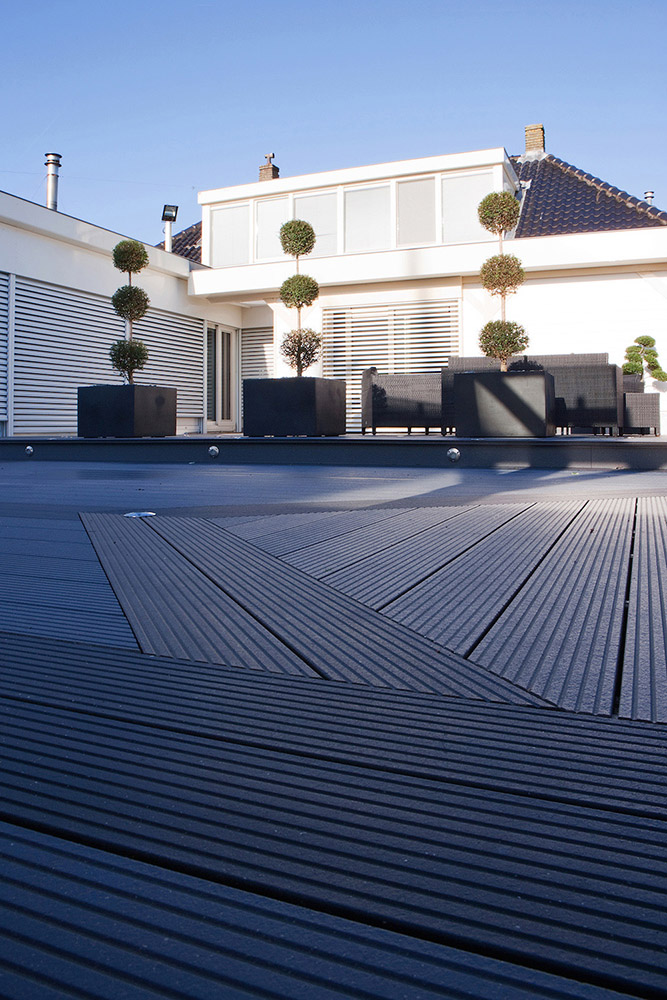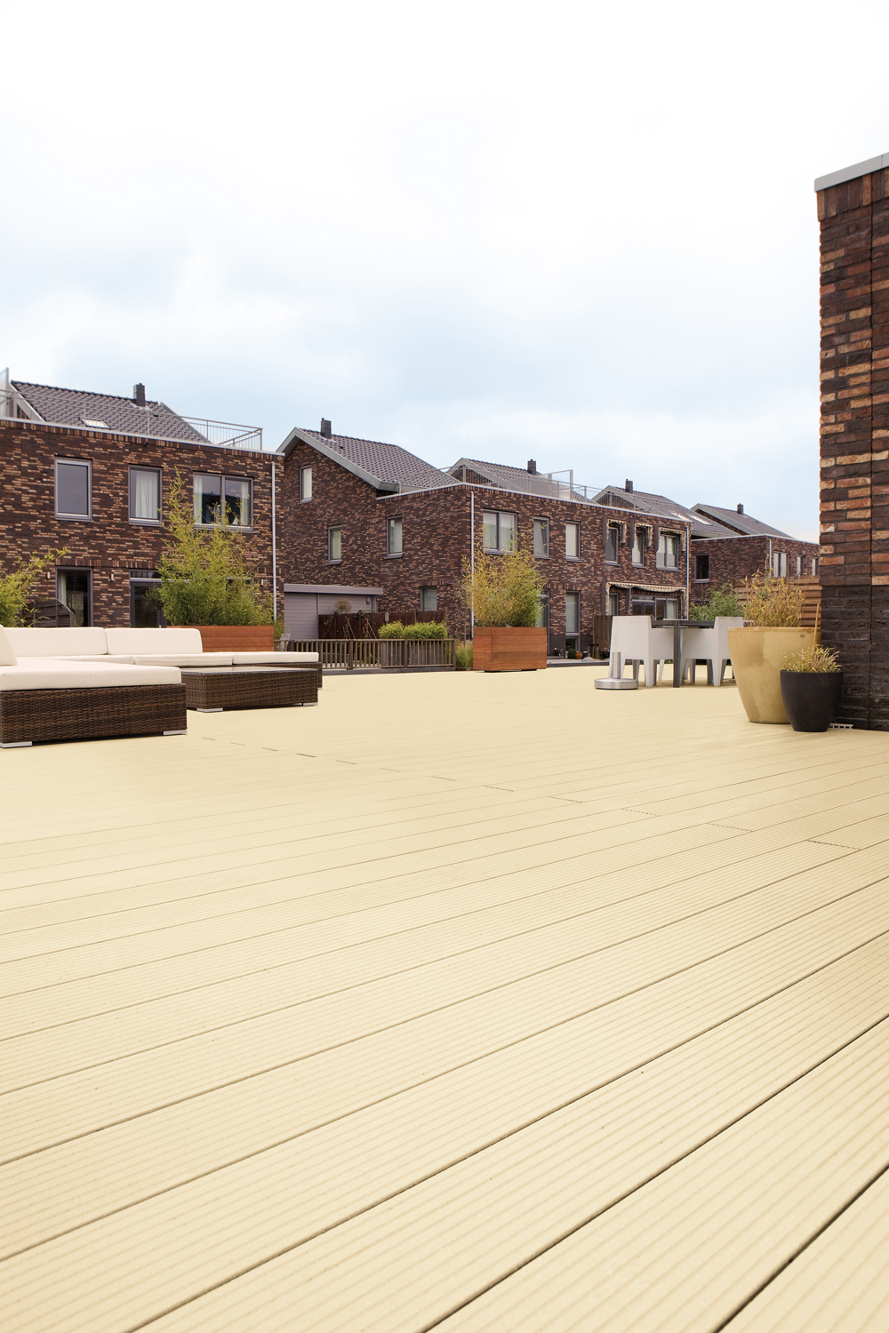 Der Verbundwerkstoff verfügt über eine hohe Schlagfestigkeit und bietet sowohl in nassem als auch in trockenem Zustand hohe Rutschfestigkeit. Dank der geschlossenen Oberfläche wird Feuchtigkeit, anders als bei Holz, nicht absorbiert. UPM ProFi Dielen können deshalb mit Null-Grad-Gefälle installiert werden.
