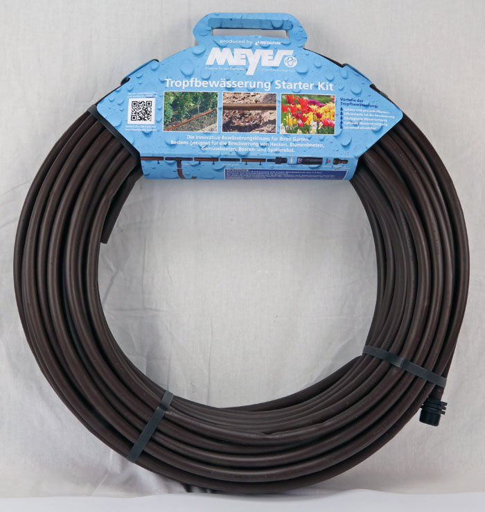 Die einfachste Variante ist der druckkompensierte Tropfschlauch, mit dem sich Reihenbewässerungen (z.B. Hecken oder Beete) realisieren lassen. Alle 30 cm sitzt ein Tropfer, der zuverlässig 1,6 ltr. Wasser pro Stunde abgibt. Das lästige Konfigurieren der Einzelteile wird durch das Meyer- Starterkit erspart. 50m Tropfschlauch, Filter, Druckminderer, Steckverbinder usw. stecken montagefertig in der Packung. Auch an T- Verbinder für die Verzweigung hat Meyer gedacht.