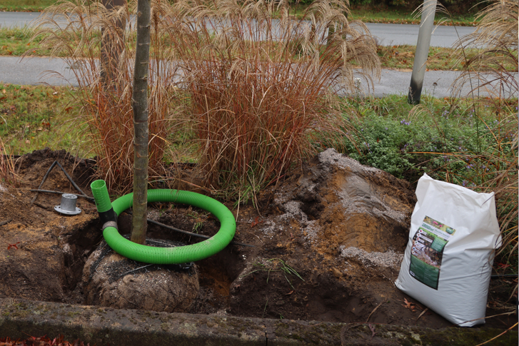 für Mikroorganismen ist unter anderem Bentonit enthalten, dass je Gramm eine innere Oberfläche von 600 m² aufweist. Das Ganze ist mit einem natürlichen Dünger aufgedüngt und zusätzlich mit Mykorrhiza versehen, die dem Baum einen größeren Wurzelraum erschließt. Perlite wirkt dauerhaft einer Bodenverdichtung entgegen. GROWtect PflanzVital Retentis® wird bei Neupflanzungen mit ca. 3 kg/ m³ eingesetzt, ist aber für die Altbaumsanierung auch lanzengängig.