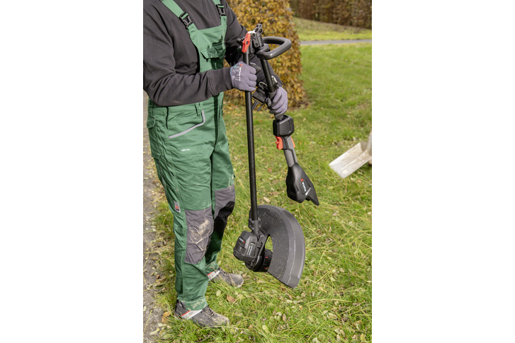 Der Zweihandgriff und der Schultergurt gewährleisten einen hohen Benutzerkomfort und eine optimale Führung. Der einfache Fadenspulenwechsel ermöglicht in der Alltagspraxis einen effizienten Arbeitsablauf. Ein integrierter Klappmechanismus garantiert zudem ein Platz sparendes Verstauen und Transportieren. Das Abrufen der Höchstleistung erfolgt in weniger als einer Sekunde und sorgt somit für eine effektive Beseitigung von dichtem Bewuchs.