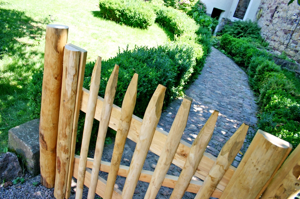 Ob runde oder halbrunde senkrechte Staketen, oberer Abschluss mit abgestumpfter Spitze oder geradem Schnitt oder mit zweifach geschälten, „glatteren“ Staketen – „Astwerk“ wird auftragsbezogen gefertigt und ist daher in vielseitigen, ja sogar individuellen Ausführungen lieferbar. Darüber hinaus sind zum Zaunsystem passende Türen und Tore erhältlich.