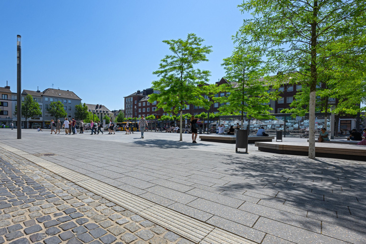 Verlegt wurde Vajo in den beiden Reihenbreiten 40 × 20 cm und 60 × 30 cm, die sich in unterschiedlicher Reihenfolge abwechseln. So ergibt sich in diesen Bereichen eine Strukturierung, die die Fläche optisch auflockert, ohne dabei unruhig zu wirken. Den Übergang zum Natursteinpflaster bildet eine Läuferreihe der Rillenplatten für das Blindenleitsystem, das auch im Gefahrenbereich der Bushaltestellen am Platzrand zum Einsatz kam.